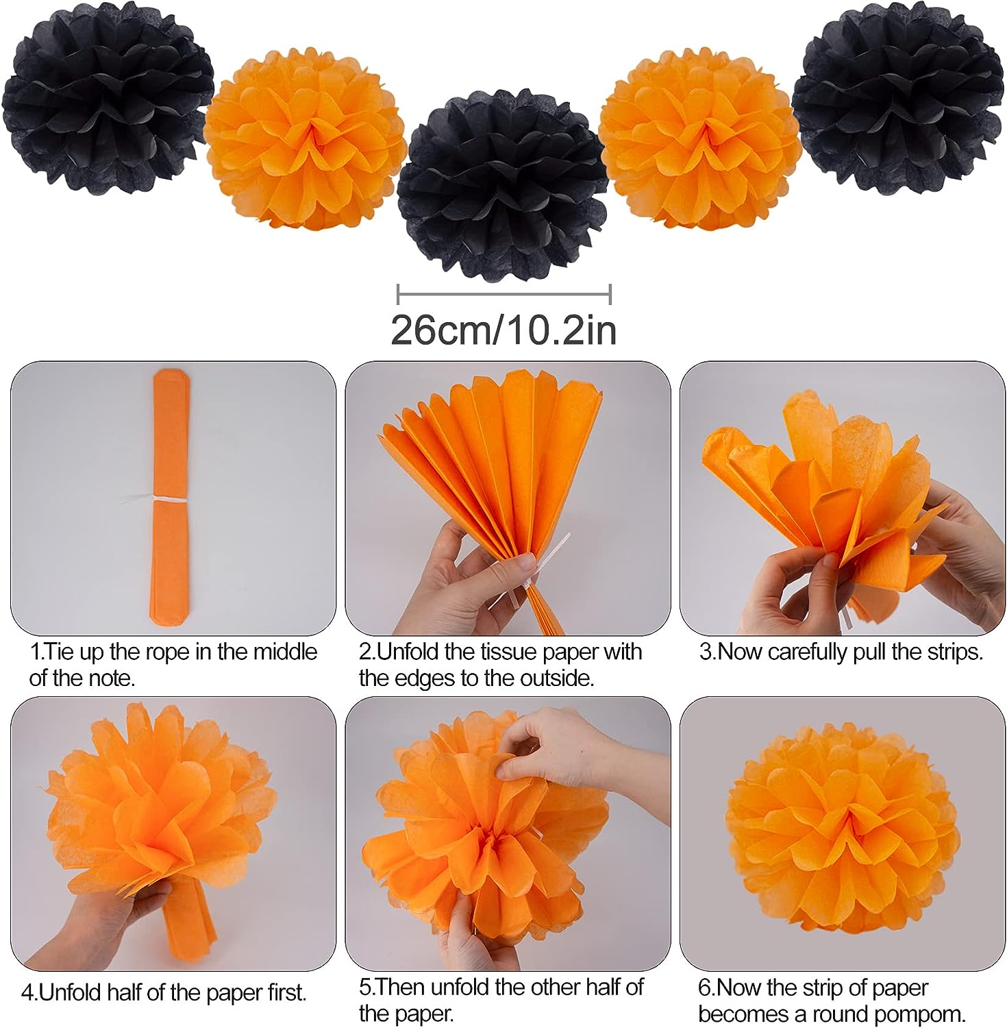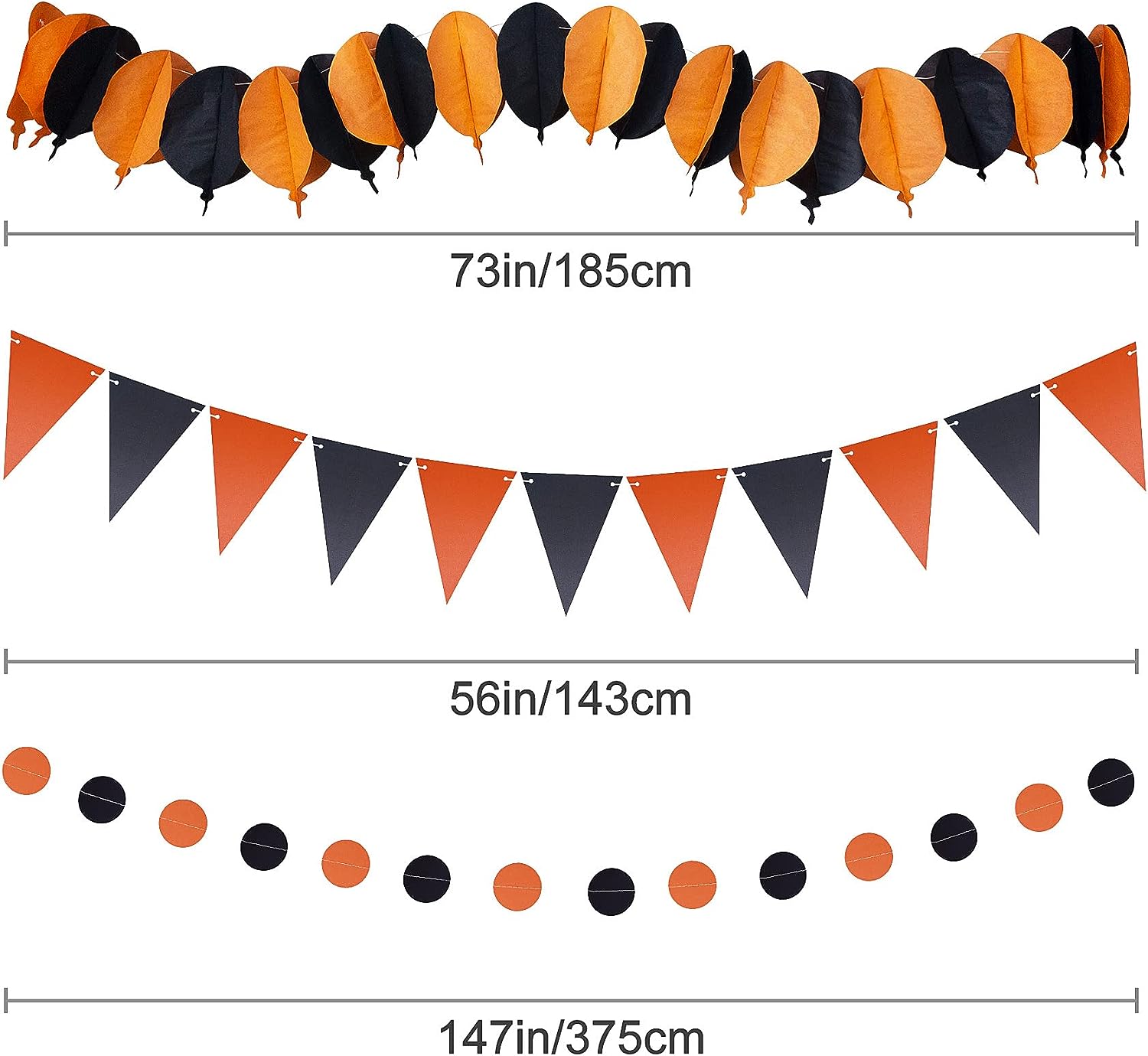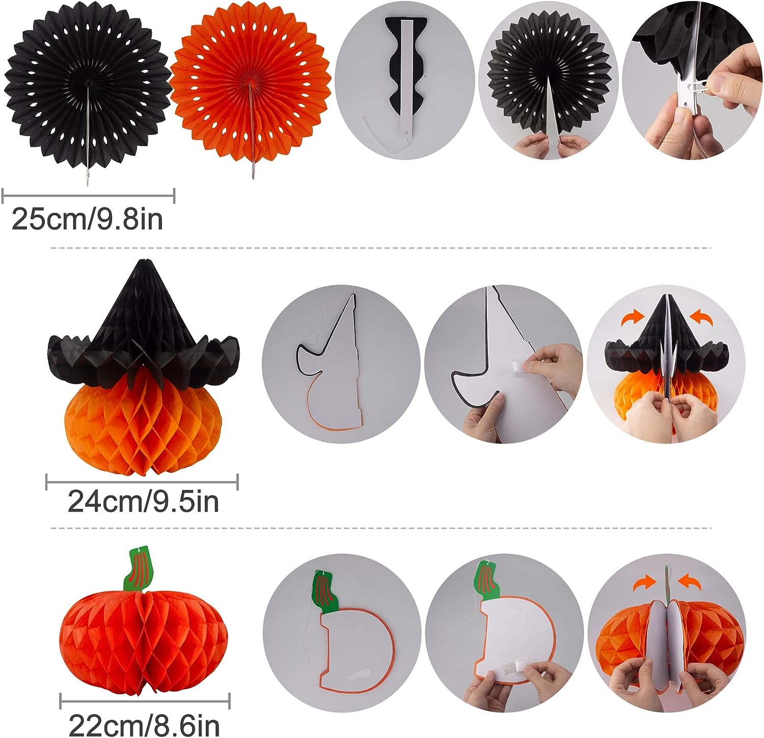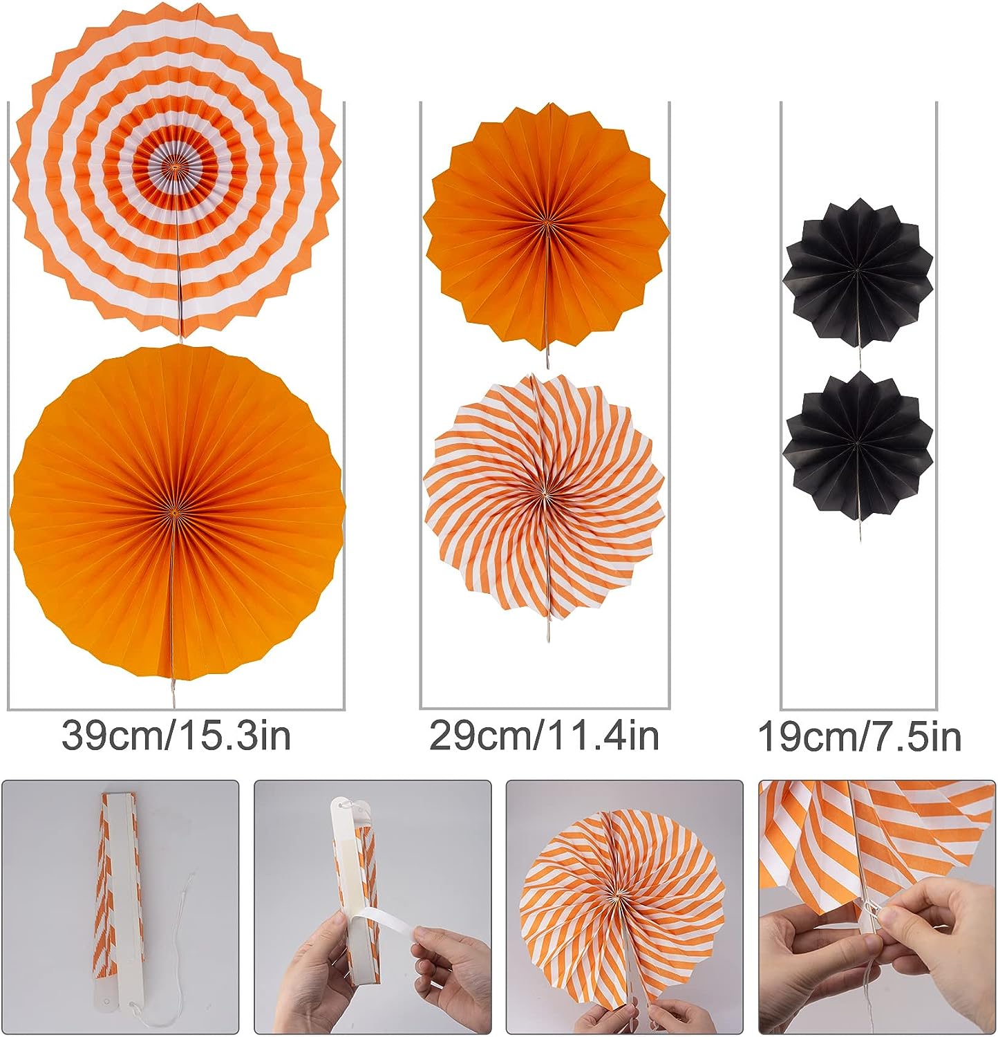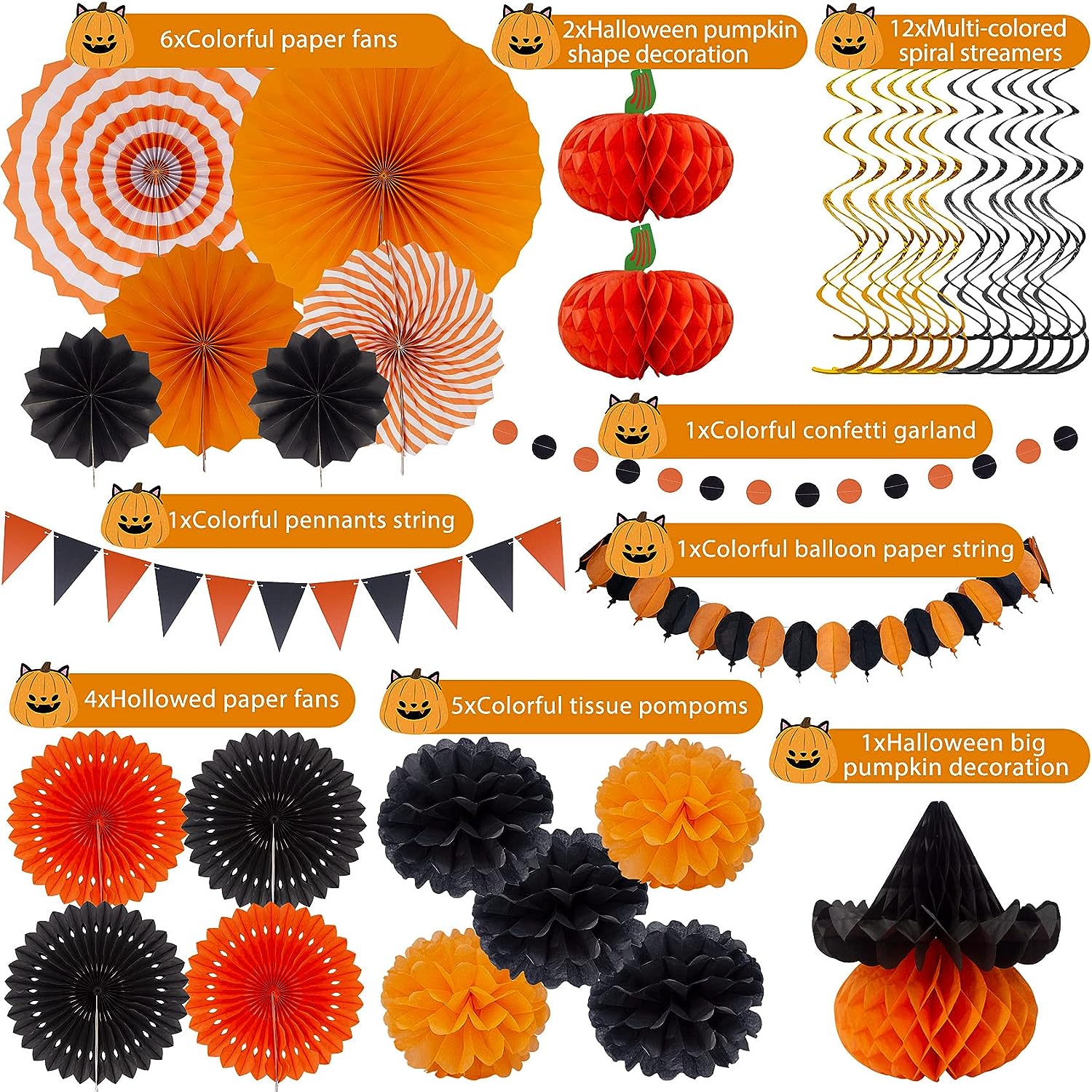 【Package Contents】5 tissue pom-poms, 2 orange + 3 black, 10 inches (25 cm) in diameter; 6 Halloween paper fans: 8 inches (20 cm)*2, 12 inches (30 cm)*2, 15.7 inch (40 cm)*2; Halloween Hollow Paper Fan 2 Black, 2 Orange, 10" (25 cm) in diameter; 1 Halloween Balloon Paper String, 90" (2.3 m) long; 1 Halloween Pennant String, Long 108" (2.7 m); 1 Halloween Confetti Wreath, 144" (3.7 m) long; 12 Multicolor Spiral Streamers, 25" (65 cm) long; 1 Halloween Hooded Pumpkin, 2 Halloween Pumpkins.